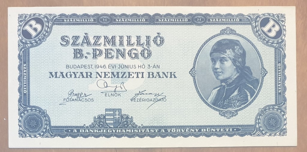 The note I purchased is the highest denomination circulated note at 100 Million BPengo”, or 100 Million Billion Pengo”. I purchased this for $95 at a coin and stamp fair. This is my most favorite note, reflecting the worst that can occur during economic mismanagement.