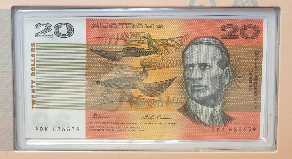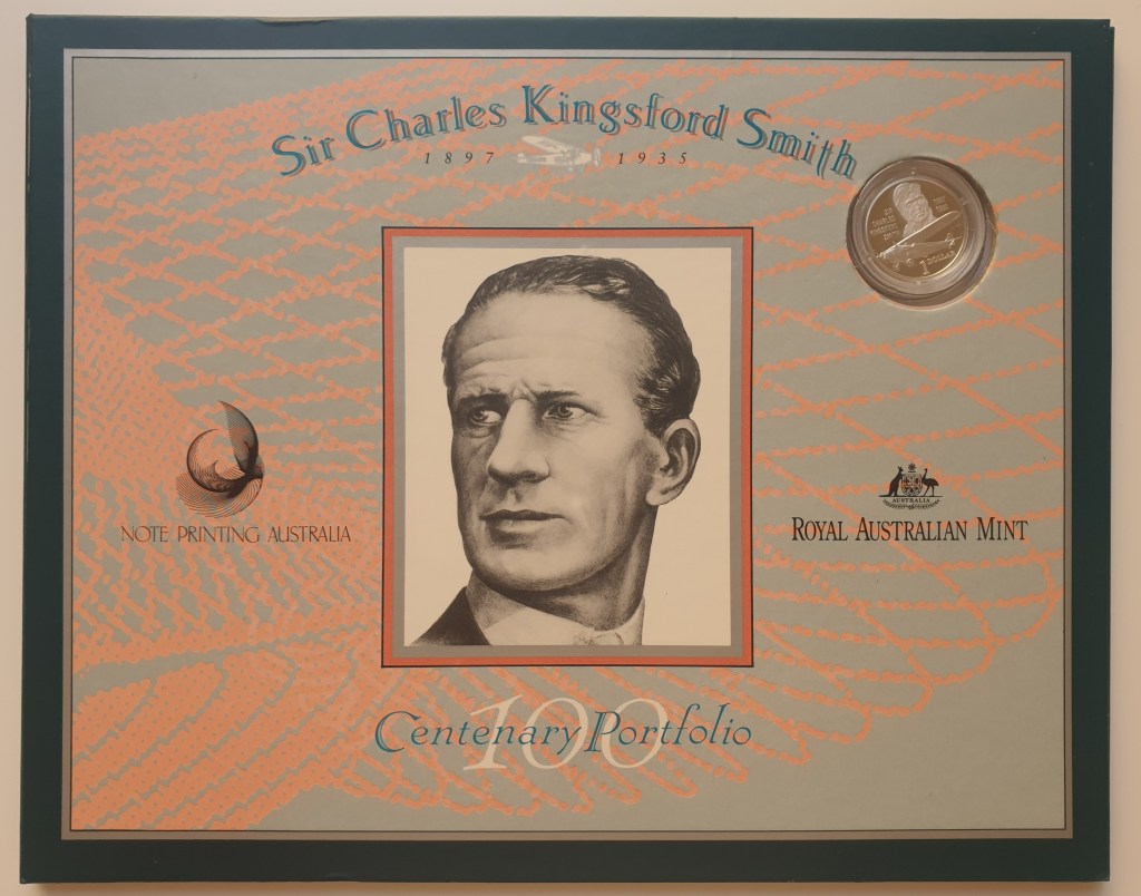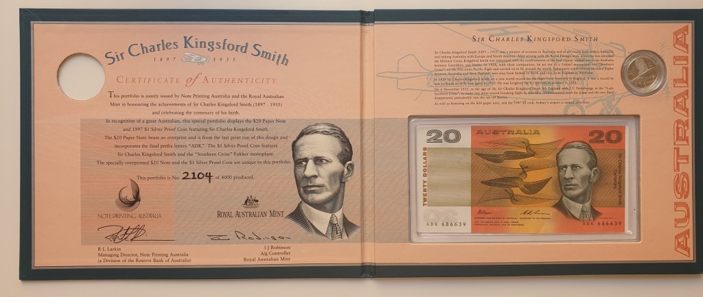 The portfolio contains a 1993 last Prefix (the last letters of the serial for that year) paper $20 note and a silver proof $1 1997 coin featuring Kingsford Smith.